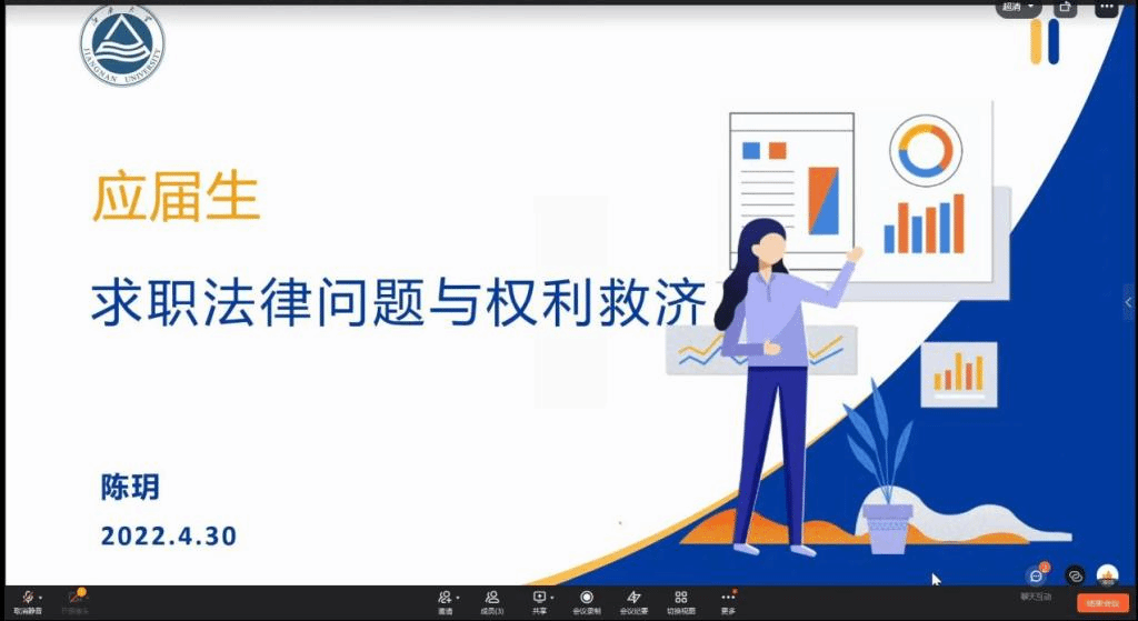 4月30日晚,江南大学职业导航季系列活动之“职业‘法’师,协君高就—职场小白入职第一课”在钉钉平台线上顺利举办。活动邀请到劳动法专家、国家三级心理咨询师陈玥讲述职场真实案例,为即将踏入职场的毕业生们科普劳动法。本次线上活动吸引了500余名同学在线参加。