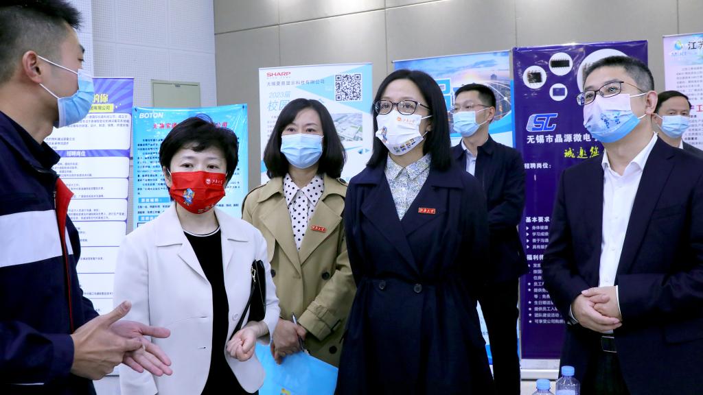座谈会后,与会领导和嘉宾还前往江南大学北区大学生活动中心招聘会现场进行了实地考察和指导交流。据悉,自9月26日开放线下组团招聘以来,学校招生就业处与无锡各市区人才服务中心积极联系,目前已邀请高新区(新吴区)、梁溪区、经开区、锡山区以及江阴市人力资源和社会保障局组团进校开展毕业生专场招聘活动,累计组织200多家重点单位参与,提供了4000多个优质岗位,据不完全统计,学校共有近千名毕业生参会投递简历,详细了解无锡和企业落户、安居、生活补贴、社保补贴等一系列引才政策。