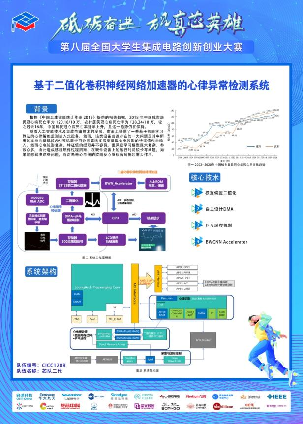由虞致国老师指导,张赵炜、刘光辉、陈晓岩三位本科生组成的团队荣获全国一等奖,作品《基于二值化卷积神经网络的心律异常监测系统》以loongarch处理器软核为控制中心,围绕高云GW5AT FPGA开发板设计显示通路、加速通路两个通路为主要实现逻辑,以流式架构的二值化卷积神经网络(BWCNN)硬件加速器为设计核心,对输入的二维心电数据进行神经网络算法进行边缘加速处理,实现三分类结果:Normal beat(心律正常)、Premature VC(室性早搏)、Bundle Branch Block(房室束支传导阻滞-L&R),实时显示被监测者的心律状况,做到高性能、低延时、低功耗。