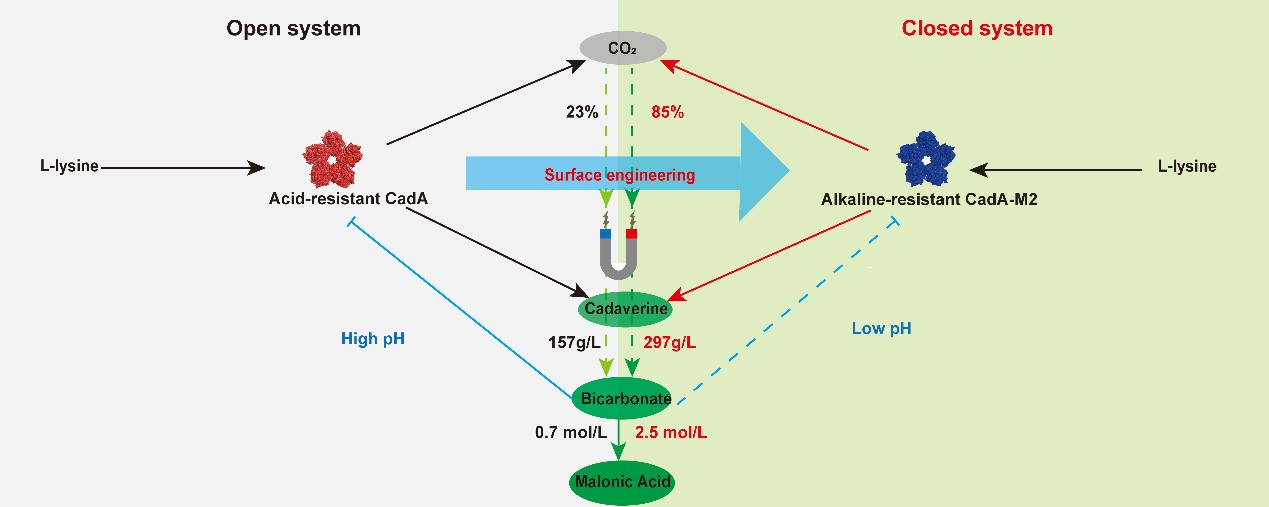 针对上述问题,江南大学生物工程学院邓禹教授课题组提出了一种将戊二胺高效生物合成与自驱动原位CO₂捕获相结合的创新策略。该策略的核心在于对赖氨酸脱羧酶(CadA)进行理性改造,构建出耐碱性更强、催化效率更高的突变体CadA-M2。该突变体在pH 7.0–10.0范围内展现出优异的酶学性能,表现为最低的Km值与最高的kcat/Km值。在此基础上,研究团队利用CadA-M2开展全细胞催化实验,在5L密闭式生物反应器中实现了297.0 g/L的创纪录戊二胺单批次产量。更为重要的是,反应过程中约85%的CO₂以碳酸氢盐形式被原位捕获,显著减少了碳的外排放。进一步地,研究将捕获的碳源引入工程化解脂耶氏酵母体系,实现了向高附加值C3有机酸——丙二酸的生物转化。该过程将CO2捕获与多胺生物合成相结合,提高了二氧化碳固定效率,并实现了有价值化学品的可持续生产,为减少生物源二氧化碳排放提供了有希望的解决方案,并为生物制造和可持续发展提供了创新途径。